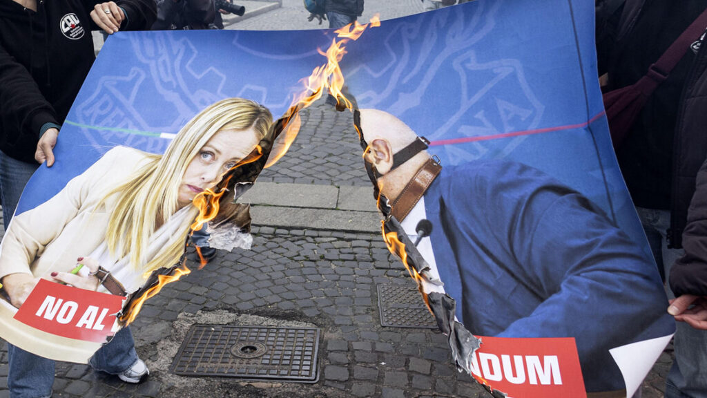 Più netto ancora il partito della premier: “Scende in campo l’odio rosso”, scrive FdI sui social. Dal fronte delle opposizioni parla Giuseppe Conte, che condanna qualsiasi forma di “violenza” e vede però dietro l’angolo il rischio di “strumentalizzazioni”. Da qui l’invito a combattere solo con la “forza delle idee”. La prima immagine raffigurava la premier mentre teneva al guinzaglio, con tanto di museruola, il ministro della Giustizia; la seconda rappresentava la stretta di mano tra Meloni e Netanyahu. Ma per le strade della capitale non ci sono stati solo i cartelloni dati alle fiamme: c’è chi avrebbe portato “una bambola che raffigura Giorgia Meloni su una barella del pronto soccorso”, racconta la vicepresidente di Fratelli d’Italia alla Camera, Augusta Montaruli. Intorno, dice sempre l’esponente del partito della premier, alcune manifestanti: “Quando una donna non è della loro parte politica, improvvisamente diventa legittimo umiliarla”. Manca una settimana al voto sul referendum sulla separazione delle carriere e la riforma del Csm: sette giorni ancora di campagna elettorale in un clima di crescente tensione con i partiti impegnati sul territorio. Forza Italia, che conduce la battaglia in nome di Silvio Berlusconi, ha inventato le Frecce per il sì: treni con a bordo esponenti del partito e simpatizzanti che per due giorni hanno attraversato l’Italia dal Nord al Sud.