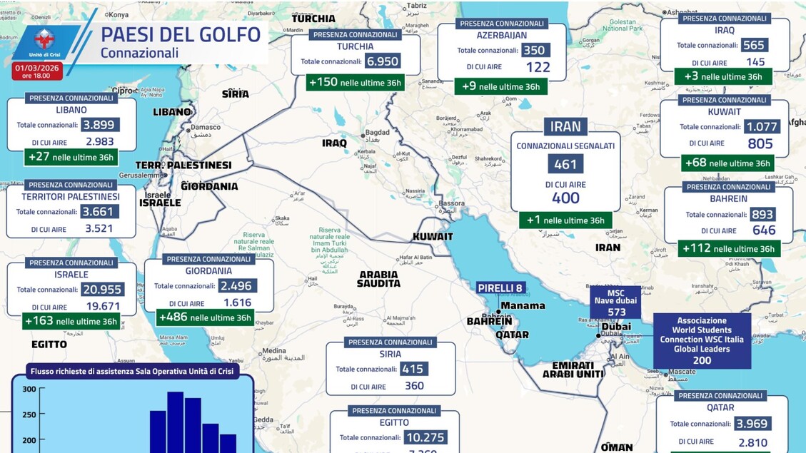 Sono iniziati i primi rientri di gruppi di italiani bloccati in Medio Oriente: domani con un volo speciale Abu Dhabi-Milano torneranno circa 200 studenti minorenni ed è partito oggi un primo volo charter con 127 cittadini italiani bloccati in Oman o trasferiti da Dubai in Oman con assistenza della Farnesina. Ma resta alta l’attenzione per i tantissimi italiani che si trovano ancora in quell’area. “Nella regione sono al momento presenti oltre 70.000 nostri connazionali tra presenze stabili, quasi l’80% e temporanee, 30.000 circa solo a Dubai e Abu Dhabi. In Israele vivono circa 20mila residenti con passaporto italiano”, fa sapere il ministro degli Esteri, Antonio Tajani, che assicura che la sicurezza degli italiani “è la priorità” e che va avanti l’organizzazione in queste ore di voli da Muscat alla volta dell’Italia, oltre a quello già partito. “E’ come se fossimo in una sorta di lockdown. Le auto non girano per strada, tutto fermo, scuole chiuse. Sentiamo solo dei rumori di sottofondo”, racconta Francesca Raspavolo, 40 anni, che da 4 anni vive a Dubai, dove insegna italiano ed inglese. E’ forte l’ansia tra i docenti e le famiglie degli studenti bloccati a Dubai. “Più passa il tempo più aumenta la preoccupazione”, dice Francesco Barberis, coordinatore didattico del liceo Sant’Anna di Torino, frequentato da alcuni studenti che fanno parte del gruppo di 200 ragazzi nella città emiratina. C’è anche Luisa Corna tra gli italiani bloccati a Dubai: la cantante, conduttrice e attrice, è negli Emirati, ospite al Gala della Canzone italiana, ispirato alla tradizione del festival di Sanremo. Sarebbe dovuta ripartire sabato alla volta dell’Italia ma il suo aereo non è decollato. “C’è un clima di grande tensione e di insicurezza. E’ una sensazione bruttissima”, racconta Corna. Intanto la Farnesina sta lavorando per portare all’aeroporto di Riad gli italiani che vogliono partire da Qatar e Bahrein e sta cercando di organizzare voli per portare gli italiani che possono prenotare con linee aeree dell’Oman, facendoli arrivare da Dubai. Inoltre il ministero degli Esteri sta assistendo anche turisti italiani provenienti dalle Maldive che dovevano transitare da Dubai, e che sono migliaia: sono state attivate le procedure per organizzare voli charter. C’è un divieto per le compagnie europee di andare in quelle aree, non può dunque partire un volo Alitalia. E anche gli aerei militari, se non schermati, non possono andare in quelle zone, possono muoversi solo vettori di linee aeree dei paesi dell’area del Golfo. In queste ore gli aeroporti di Dubai hanno dichiarato che i voli ‘limitati’ riprenderanno da stasera: così faranno sia Emirates che la compagnia aerea low cost Flydubai. Etihad Airways, che opera voli da Abu Dhabi, ha dichiarato che riprenderà i voli domani. A Roma Fiumicino, su una media di circa 800 voli giornalieri nello scalo romano, sono 45 i voli da e per il Medio Oriente cancellati nella giornata di oggi, 12 quelli previsti al momento per domani. E sono ancora bloccati sulla Msc Euribia i croceristi, tra i quali molti italiani, a bordo della nave ferma nel porto di Dubai dopo lo stop al trasferimento a Doha, aeroporto di partenza per il ritorno in Italia. Mentre 71 persone, tra cui 30 materani, sono a Gerusalemme: oggi avrebbero dovuto prendere il volo di ritorno. Due marchigiani, infine, sono fuggiti da da Dubai con un’auto a noleggio e poi hanno percorso alcuni chilometri a piedi, arrivando infine in Oman.