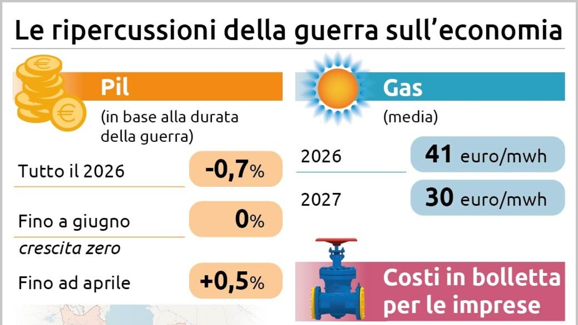 L’impatto della guerra in Iran comporta un ritocco al ribasso al +0,5% del Pil atteso per il 2026 se tutto si risolve entro questi ultimi giorni di marzo. Può portare alla stagnazione se il conflitto in Medio Oriente durerà fino a giugno con il blocco dello stretto di Hormuz ed i rischi per l’approvvigionamento di gas e petrolio.