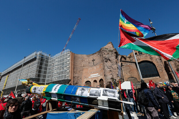 I manifestanti hanno cominciato a riempire la piazza. Davanti alla basilica di Santa Maria degli Angeli il maestro Mario del doposcuola Mammut ha ultimato un missile di legno che sfilerà insieme ai partecipanti che stanno arrivando da tutta Italia. Sulla punta ha posizionato alcuni fiori e la bandiera della pace, mentre tutt’intorno ha incollato immagini delle guerre in Medio Oriente. “Terza guerra mondiale, ma che siete matti? Non la vogliamo studiare”, si legge su un cartello. Tante le bandiere della pace, della Palestina, del Venezuela, oltre a quelle della Cgil, di Avs, e di associazioni come Amnesty International.